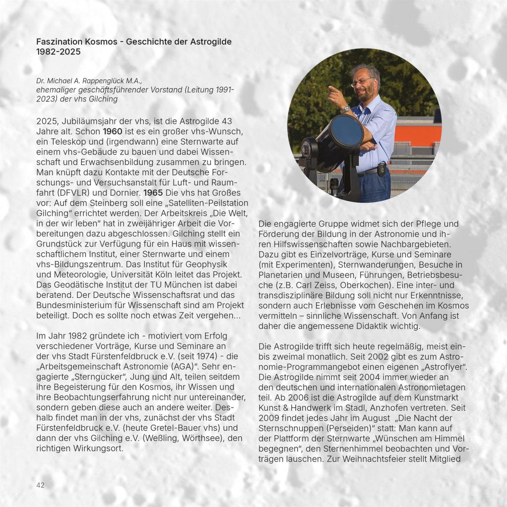 2025, Jubiläumsjahr der vhs, ist die Astrogilde 43 Jahre alt. Schon 1960 ist es ein großer vhs-Wunsch, ein Teleskop und (irgendwann) eine Sternwarte auf einem vhs-Gebäude zu bauen und dabei Wissenschaft und Erwachsenbildung zusammen zu bringen. Man knüpft dazu Kontakte mit der Deutsche Forschungs- und Versuchsanstalt für Luft- und Raumfahrt (DFVLR) und Dornier.