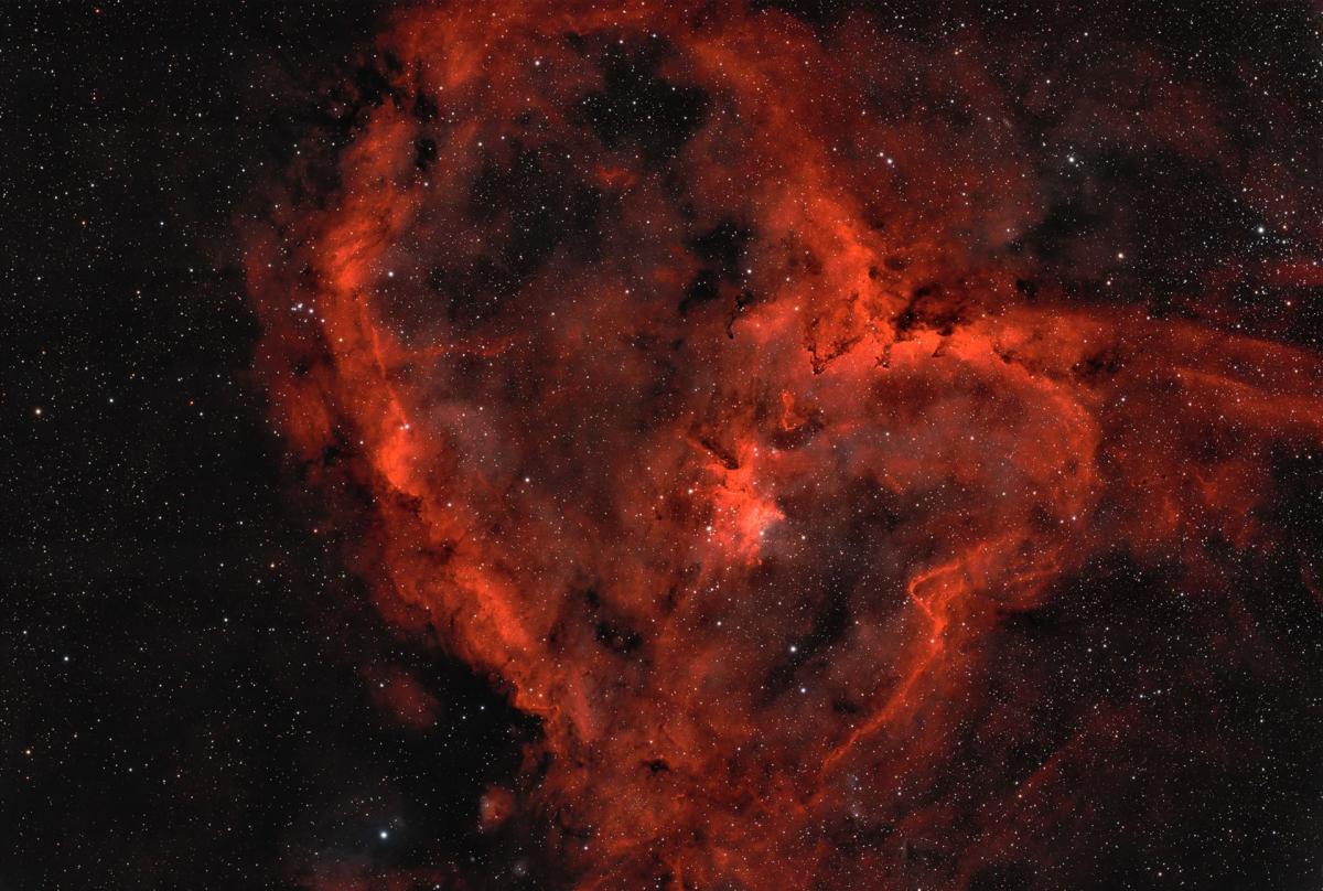 Der Herz-Nebel (IC1805) ist ein großflächiger Emissionsnebel im Sternbild Kassiopeia, etwa 7.500 Lichtjahre von der Erde entfernt. Seine charakteristische Form erinnert an ein anatomisches Herz. Der Nebel wird von einem offenen Sternhaufen namens Melotte 15 durchdrungen, dessen junge, massereiche Sterne starke stellare Winde erzeugen und die Gaswolken formen. Der Herz-Nebel besteht hauptsächlich aus ionisiertem Wasserstoff (Hα) und breitet sich über ungefähr 200 Lichtjahre aus. Die intensiven Farben in der Astrofotografie entstehen durch Schmalbandfilterung, die einzelne Elemente wie Schwefel, Wasserstoff und Sauerstoff hervorhebt. Der Nebel ist ein Paradebeispiel für die Kräfte, die bei der Sternentstehung wirken.