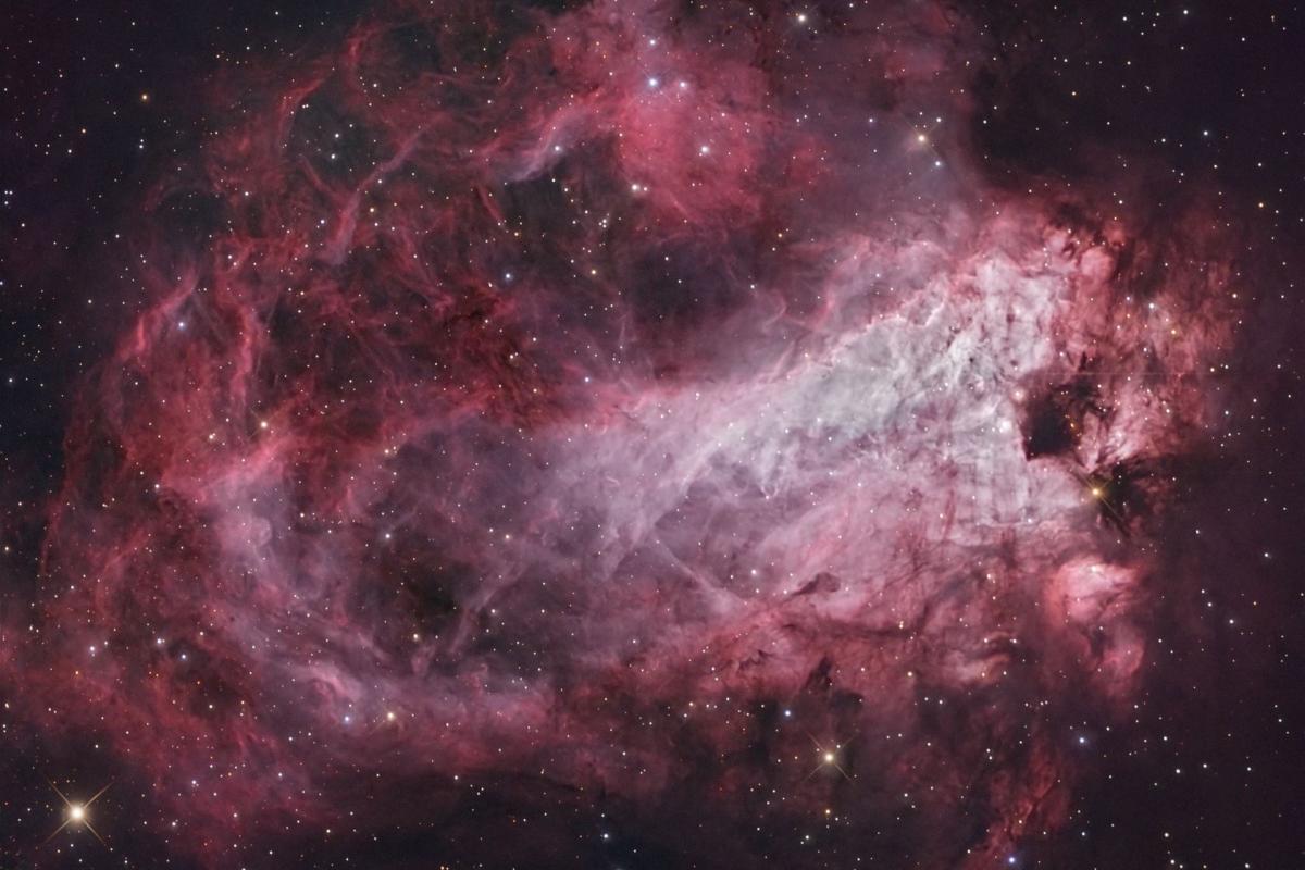 Der Omeganebel, auch Schwanennebel genannt, ist ein Emissionsnebel aus ionisiertem Wasserstoff. M17 enthält einen der jüngsten Sternhaufen in unserer Galaxie, mit Sternen die nur ca. 1 Million Jahre alt sind und durch ihre Strahlung den Nebel in intensiver roter Farbe zum Leuchten anregen. Dazwischen liegen dunkle Staubstrukturen, die interessante Kontraste erzeugen. Ein besonders feines Detail zeigt sich in den äußeren Regionen des Nebels: ein schwacher, bläulicher Schimmer, der sich wie ein Schleier von der Hauptstruktur abhebt. Hier reflektieren feine Staubpartikel das Licht der eingebetteten Sterne und erzeugen zarte Reflexionsnebel. Er ist einer der hellsten und größten Sternentstehungsregionen in unserer Galaxie und zählt mit seiner eindrucksvollen Struktur zu den schönsten Nebeln des Sommerhimmels. M17 befindet sich im Sternbild Schütze.