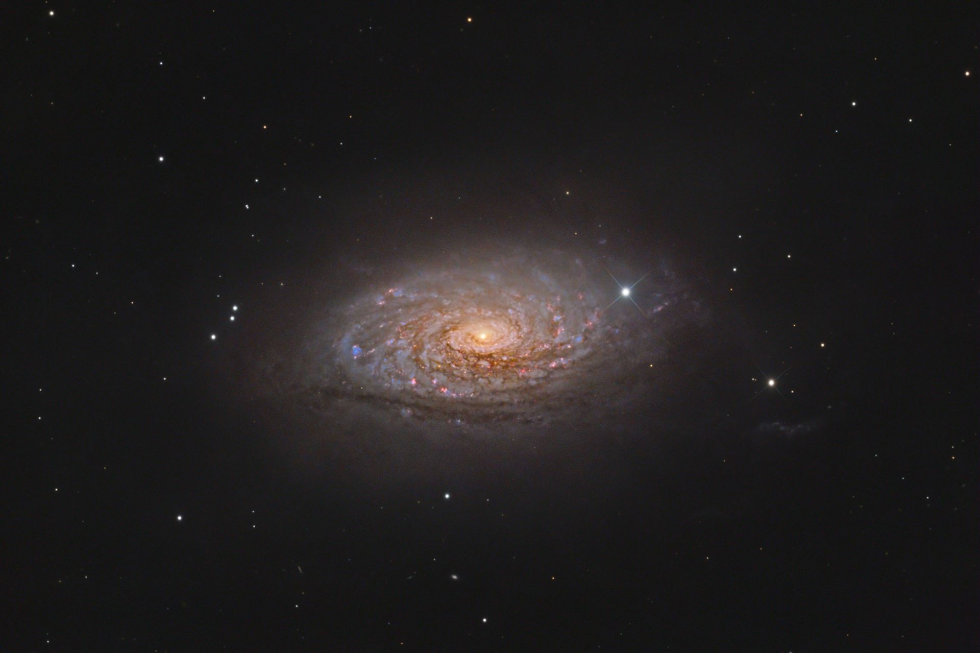 M 63 ist eine Spiralgalaxie im Sternbild Jagdhunde – etwa 27 Millionen Lichtjahre entfernt und einem Durchmesser von ca. 50.000 Lichtjahren. Ihre hellen, locker gewundenen Spiralarme erinnern in Form und Struktur an die Blüten einer Sonnenblume. In ihnen entstehen neue Sterne, während dunkle Staubbänder zwischen dem leuchtenden Licht für beeindruckende Kontraste sorgen. M63 ist nicht nur schön anzusehen – sie gehört auch zu einem kleinen Galaxienverband und zeigt, wie lebendig und vielfältig das Universum ist. M63 befindet sich im Sternbild Jagdhunde.