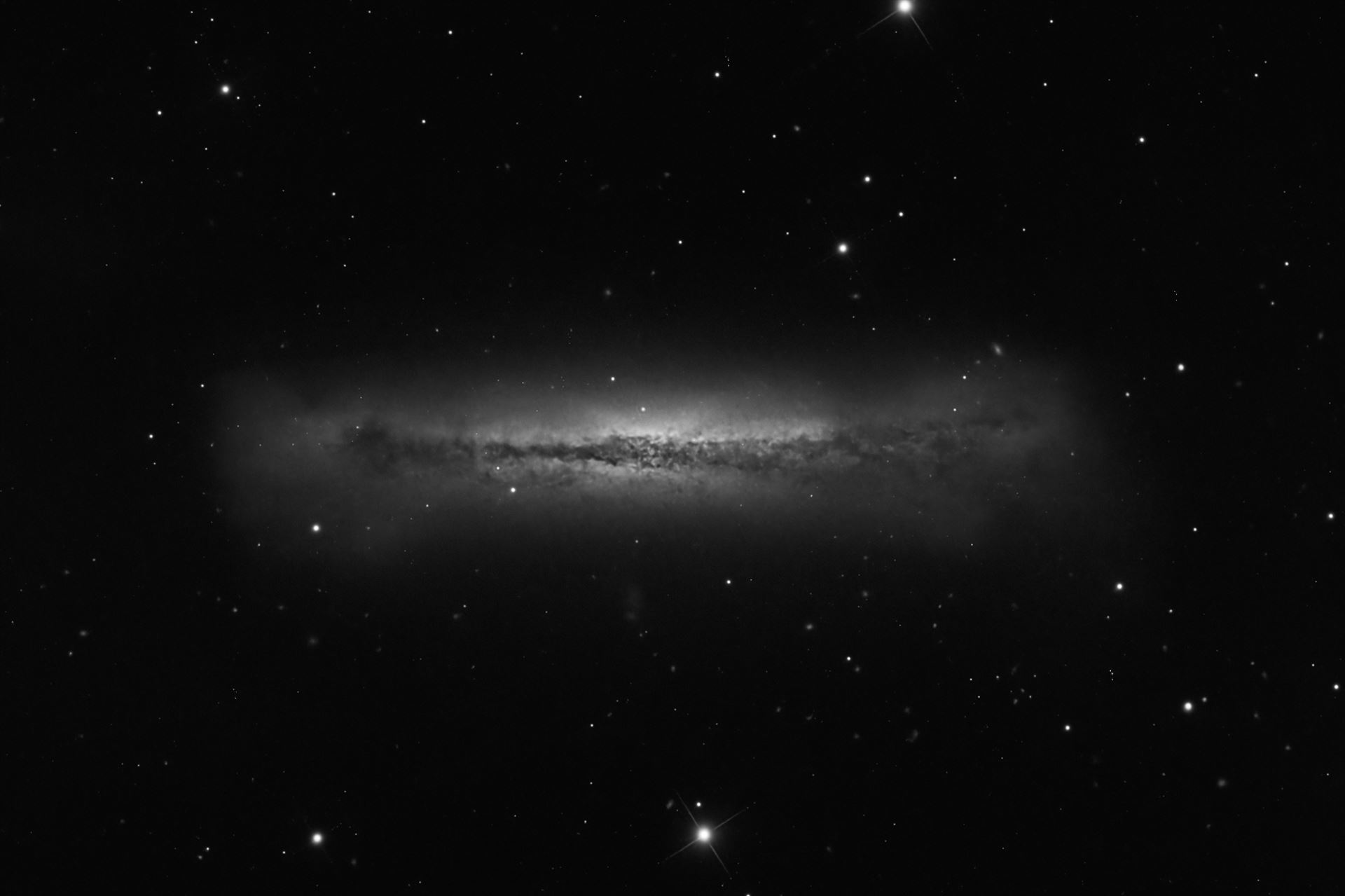 NGC 3628 ist eine markante Spiralgalaxie, die von der Erde aus genau von der Seite zu sehen ist. Es ist eine sehr aktive Galaxie, eine sogenannte Starburst Galaxie. Eine Welteninsel in welcher deutlich mehr neue Sterne geboren werden als in anderen Galaxien derselben Größe. Dunkle Staubstreifen trennen die leuchtenden Sternenregionen und verleiht ihr das Aussehen eines kosmischen Sandwiches. Sie ist Teil der Leo-Triplett-Gruppe und zeigt Anzeichen von Wechselwirkungen mit ihren Nachbargalaxien. Diese intergalaktischen Kollisionen verzerren ihre Spiralstruktur und regen die Bildung neuer Sterne an. Mit ihrer einzigartigen Form gehört sie zu den auffälligsten Galaxien am Himmel. NGC 3628 befindet sich im Sternbild Löwe.