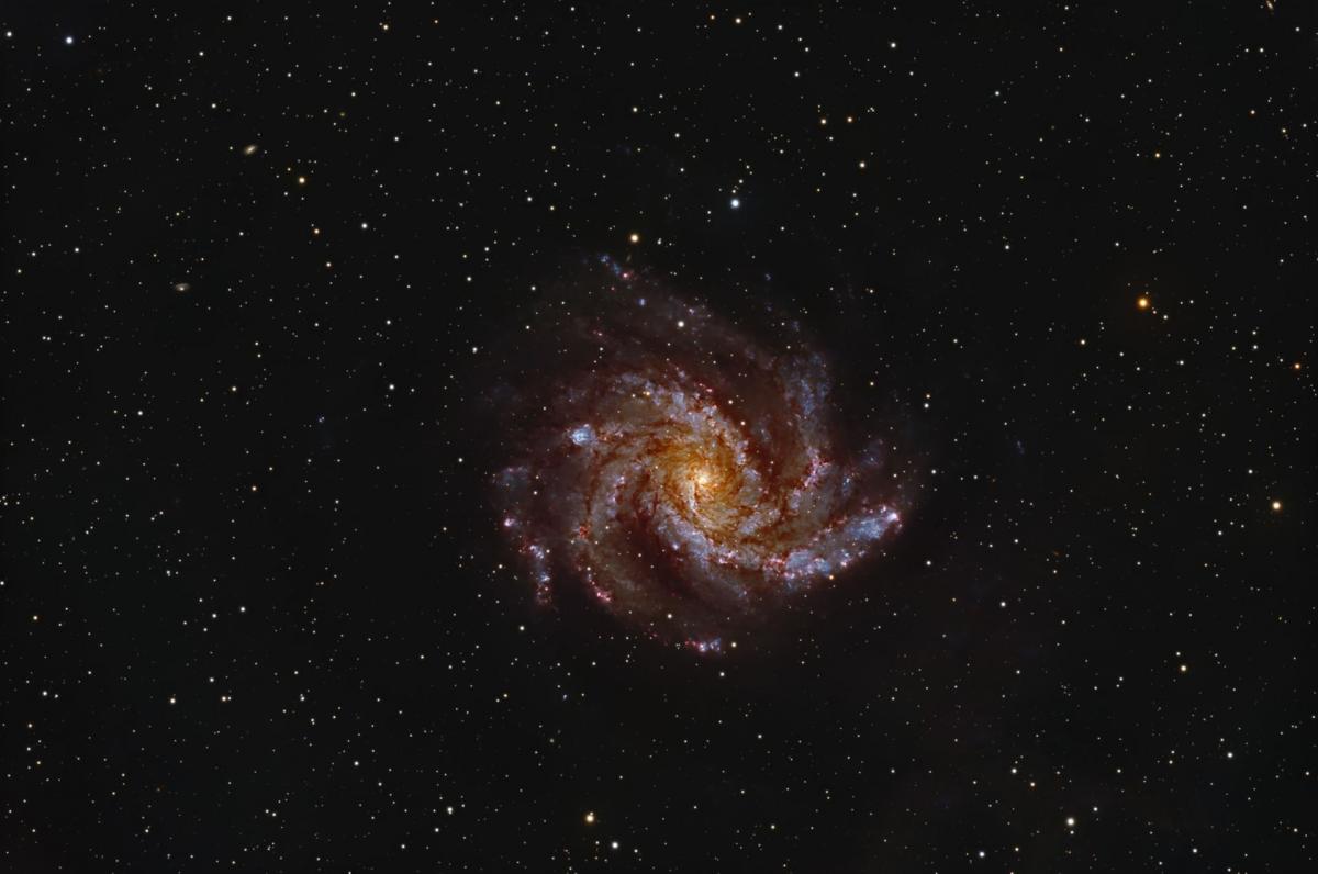 NGC6946, bekannt als Feuerwerksgalaxie, liegt etwa 22 Millionen Lichtjahre entfernt an der Grenze zwischen den Sternbildern Kepheus und Schwan. Sie erhielt ihren Namen aufgrund der ungewöhnlich hohen Anzahl an beobachteten Supernovae – zehn innerhalb eines Jahrhunderts. Mit einem Durchmesser von rund 40.000 Lichtjahren zeigt sie eine lockere Spiralstruktur mit vielen roten Sternentstehungsregionen. Aufgrund ihrer Lage nahe der galaktischen Ebene ist sie teilweise durch interstellaren Staub abgeschwächt, bleibt aber ein beliebtes Ziel für Fotografen. Ihre leuchtenden Farben und die zahlreichen HII-Regionen machen sie zu einem eindrucksvollen Beispiel für galaktische Aktivität im Universum.