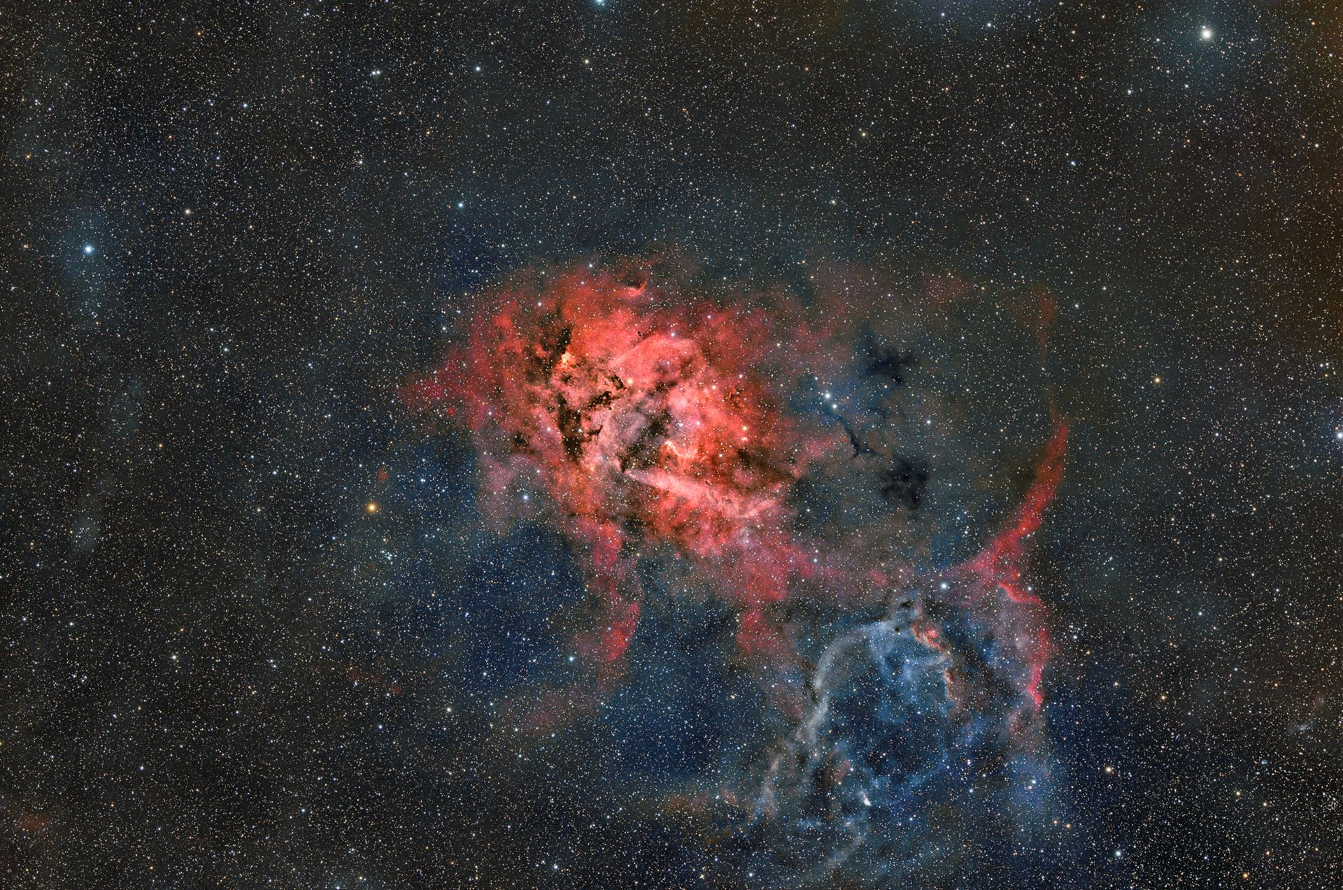 Der Löwen-Nebel (SH2-132) ist ein ausgedehnter Emissionsnebel im Sternbild Kepheus, etwa 10.000 Lichtjahre entfernt. Seine Form erinnert an den Kopf eines brüllenden Löwen, was ihm seinen Namen verliehen hat. Er gehört zu den größeren HII-Regionen mit einem Durchmesser von rund 80 Lichtjahren. SH2-132 wird von massereichen O- und B-Sternen ionisiert, deren UV-Strahlung das Gas zum Leuchten bringt. Die Nebelregion zeigt zahlreiche filamentartige Strukturen und eingebettete Dunkelwolken. In der Astrofotografie wirkt er besonders eindrucksvoll durch seine intensiven Farben in Hα- und OIII-Filtern. Er ist ein Musterbeispiel für den Einfluss heißer Sterne auf ihre Umgebung.